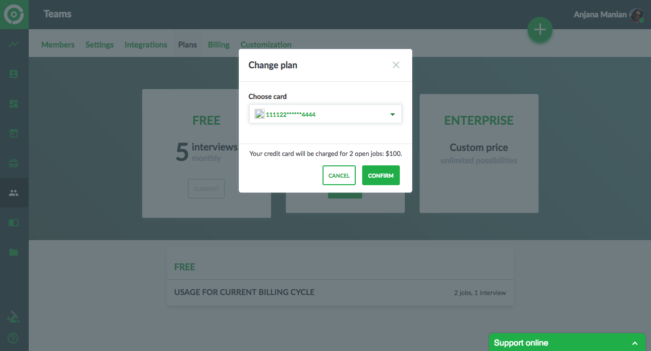 One you confirm the plan, your credit card will be charged $50/job/month. Please make sure that you close the jobs that are not relevant (e.g. Sample Job, any old job that you created during the trial period). Your subscription billing cycle starts when you choose the plan.