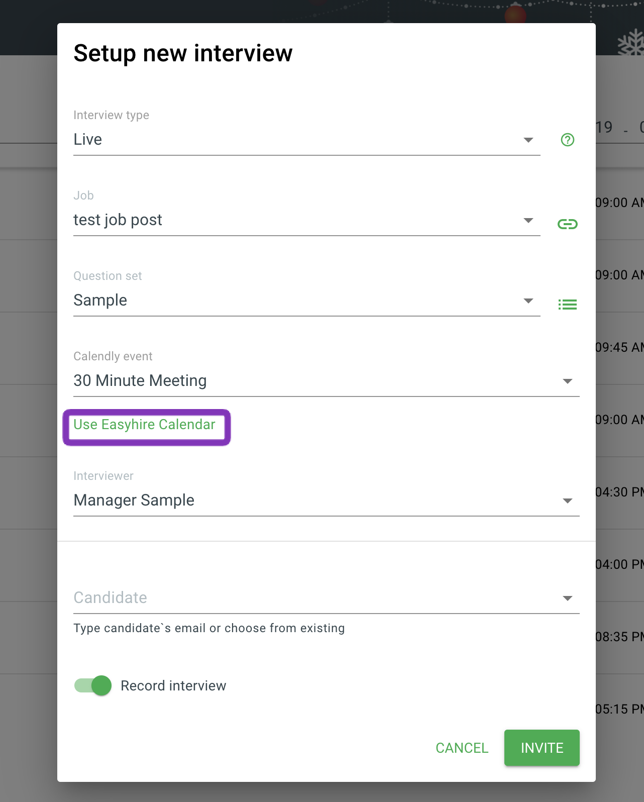 Once enabled, Calendly becomes the default option for scheduling Live interviews. Users would still be able to switch to the old method by clicking on a link next to it.