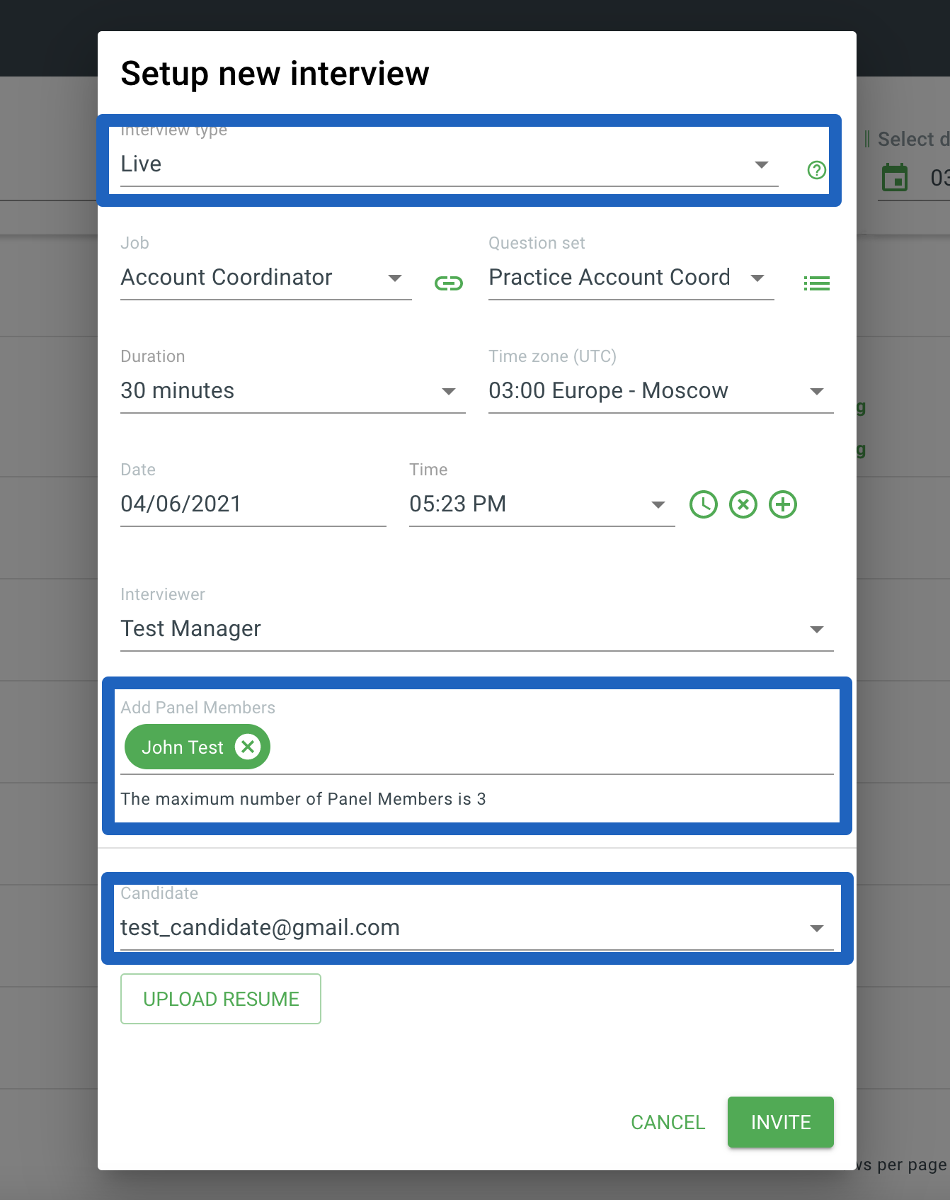 1. Click on the "+" sign and open a set up new interview window